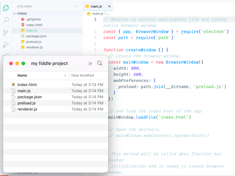 Fiddle can automatically turn your experiment into binaries you can share with your friends, coworkers, or grandparents. It does so thanks to Electron Forge, allowing you to package your fiddle as an app for Windows, macOS, or Linux.